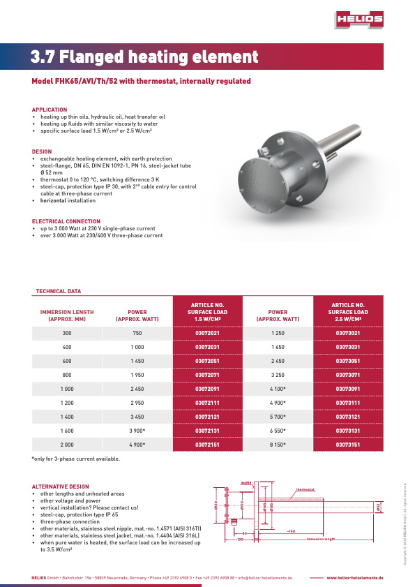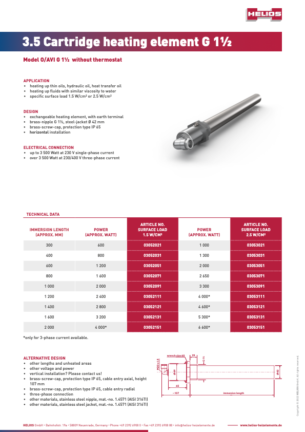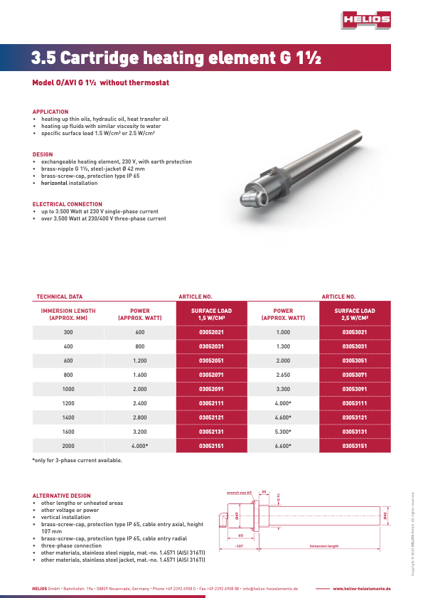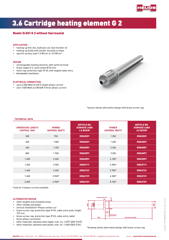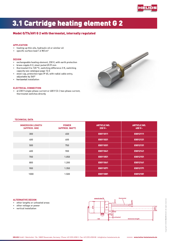 HELIOS cartridge heaters with and without control system are ideally suited to the heating of low-viscosity oil, hydraulic oil or heat transfer oil. The replaceable heating insert can be exchanged at any time. The protective tube remains installed in the tank. The medium does not need to be drained.