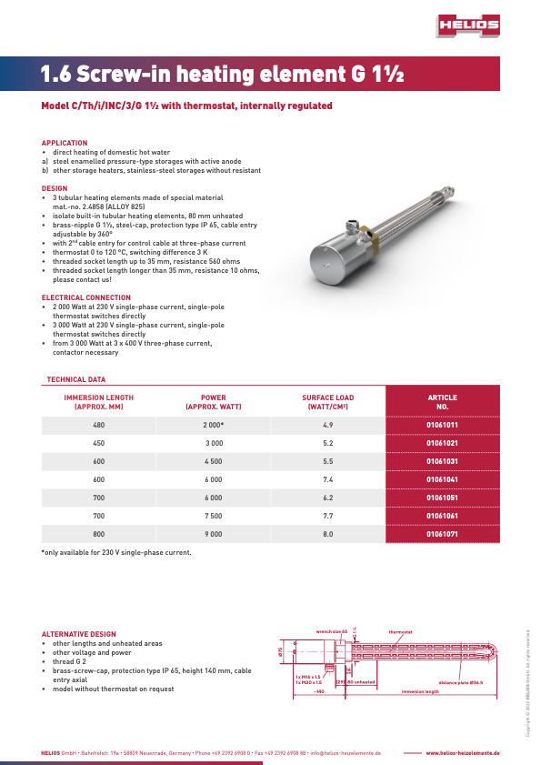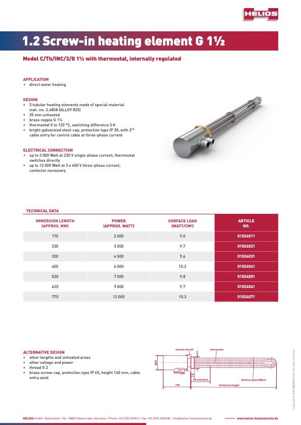 HELIOS screw-in heating elements with control systems are ideally suited to the direct heating of liquid media such as water, oil, chemicals and gaseous media.