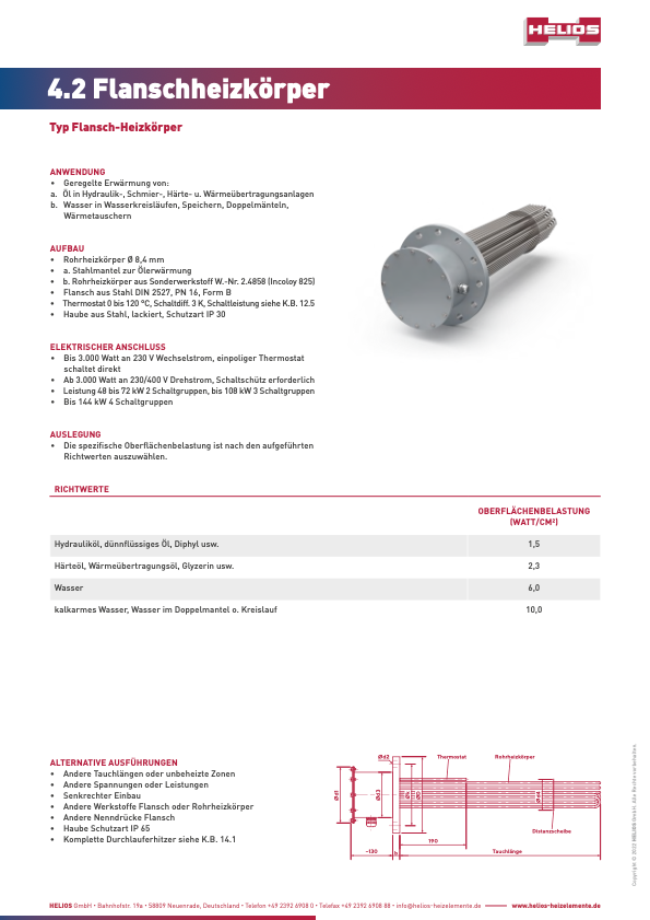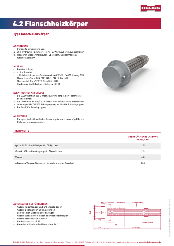 Die Oberflächenbelastung, ein ganz entscheidendes Auslegungsmerkmal für eine langlebige Haltbarkeit der Flanschheizkörper, wird für Ihren speziellen Einsatzzweck ausgewählt. Zur exakten Temperaturüberwachung können die Flanschheizkörper mit unterschiedlichen Reglern und / oder Begrenzern, sowie Meßfühlern oder Mantelthermoelementen geliefert werden. Bei höheren Temperaturen als 120 °C ist eine zusätzliche Kühlstrecke erforderlich.